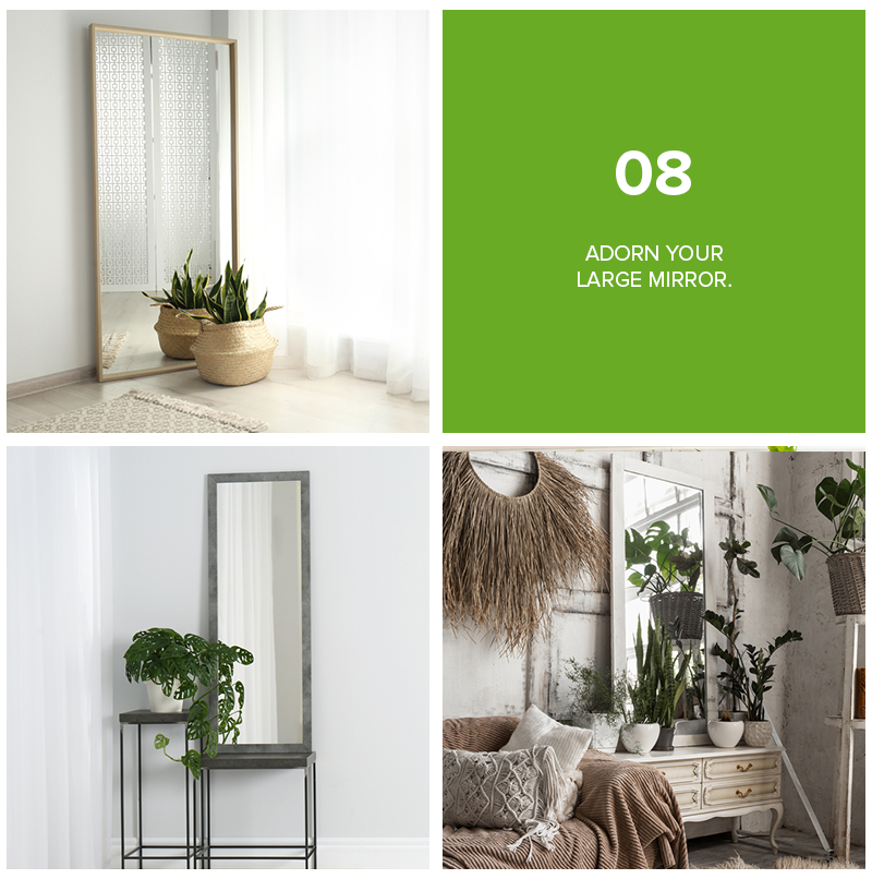 Mirrors can make a room look larger and feel more open. However, large mirrors can at times be distracting. To counterbalance the effect, place a few tiny plants or cute topiaries in front of it. You can use plant pots or containers that match the color of your mirror frame for a more harmonious effect.