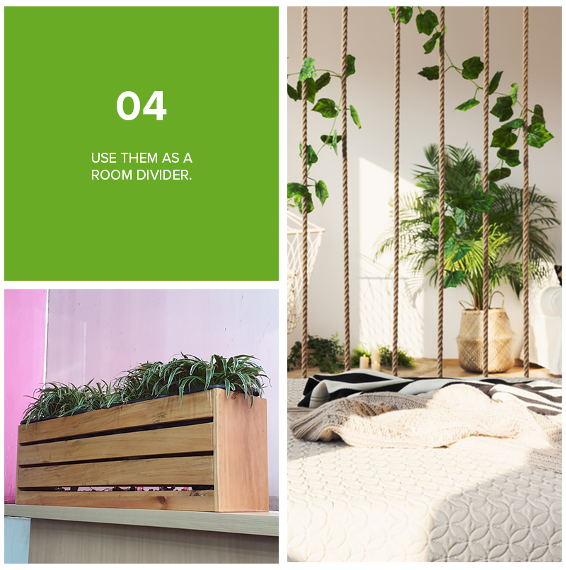 One practical way to incorporate plants into your home is to use them as a room divider. They make attractive dividers especially on houses with open floor plans or layouts, and on studio apartments where you need to create defined areas within the room. Using plants is also a great way to maximize natural light and space.
