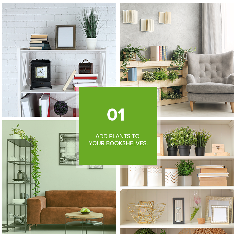 Bookshelves aren't just for books, framed photos, and other displays and accessories. If you haven’t considered this yet, try including a plant or two to your bookcase to enrich the space and add some texture. If you want to go beyond the succulents or small potted plants, place a trailing plant on the top of the shelf to add a “living layer” and create visual interest.